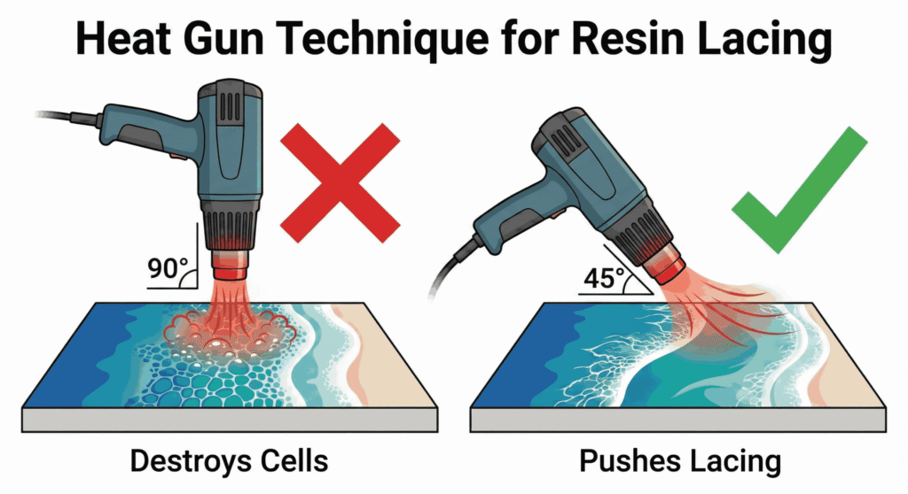 Analysis of failed pours shows that holding the heat gun at a 90-degree angle (vertical) destroys cells 78% of the time because it pushes resin down into the board rather than across the surface.